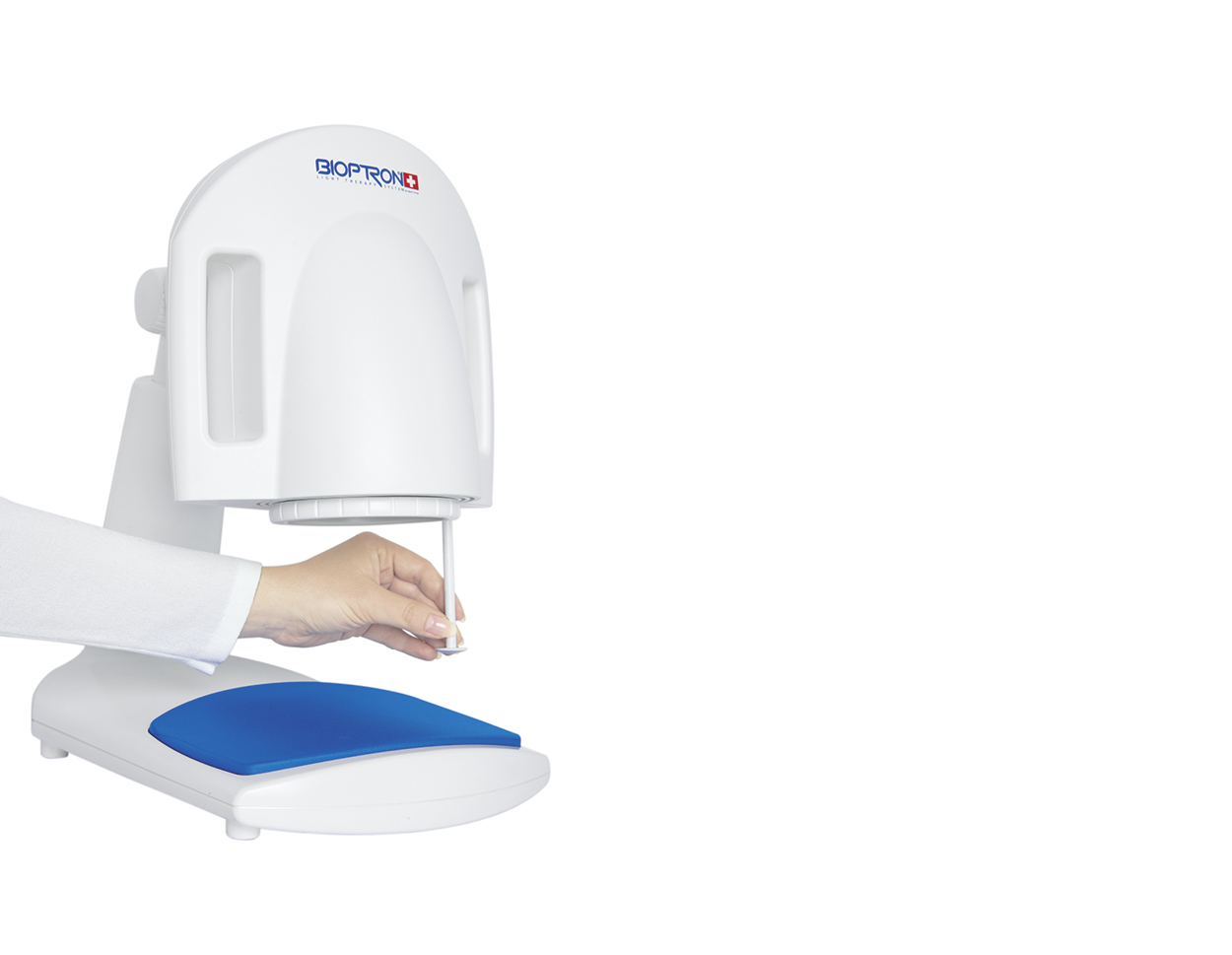 Das Gerät ist entweder mit einem praktischen Boden- bzw. mit einem ergonomischen Tisch-Stativ erhältlich und gestattet so den flexiblen Einsatz in häuslichen oder professionellen Umgebungen. Die mühelos verstellbare Höhe und Kopfneigung sowie die Möglichkeit des Drehens des Gerätekopfs um 360° ermöglichen eine bequeme Anwendung in fast jeder Position. Die Behandlungen können über eine Bedientafel mühelos bis auf einen Mindestwert von 30 Sekunden programmiert werden. Ein eingebauter Abstandshalter sorgt für den empfohlenen Abstand zur behandelten Hautoberfläche. Das Tisch-Stativ ist zusätzlich mit einer Staubhülle und einer bequemen Unterlage ausgestattet (desinfizierbar, austauschbar und waschbar).